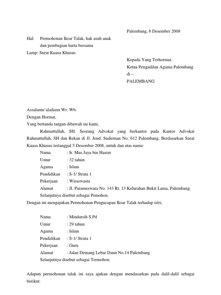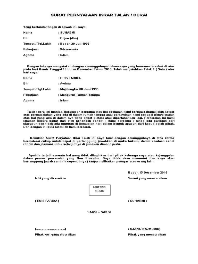 Semua isi dari surat pernyataan tersebut harus bisa dipertanggung jawabkan tanpa terkecuali, agar bisa memperoleh kepercayaan dari pihak ketiga. Ada contoh surat pernyataan kesanggupan, surat pernyataan kerja, surat pernyataan menikah, surat pernyataan sikap, dan lain sebagainya. Surat pernytaan ikrar talak ini dapat dilanjutkan atau dipergunakan sebagai bahan bukti ke pengadilan agama agar yang berwajib maklum adanya. Pdf contoh form permohonan cerai talak muhammad joko. Surat pernyataan cerai merupakan sebuah surat pernyataan yang dibuat oleh pasangan suami istri yang berisi tentang pernyataan bahwa kedua isi surat pernyataan cerai berisi tentang pernyataan bahwa kedua belah pihak sepakat untuk bercerai.